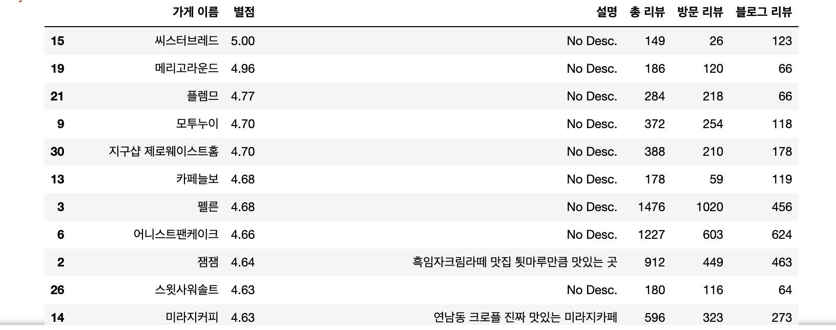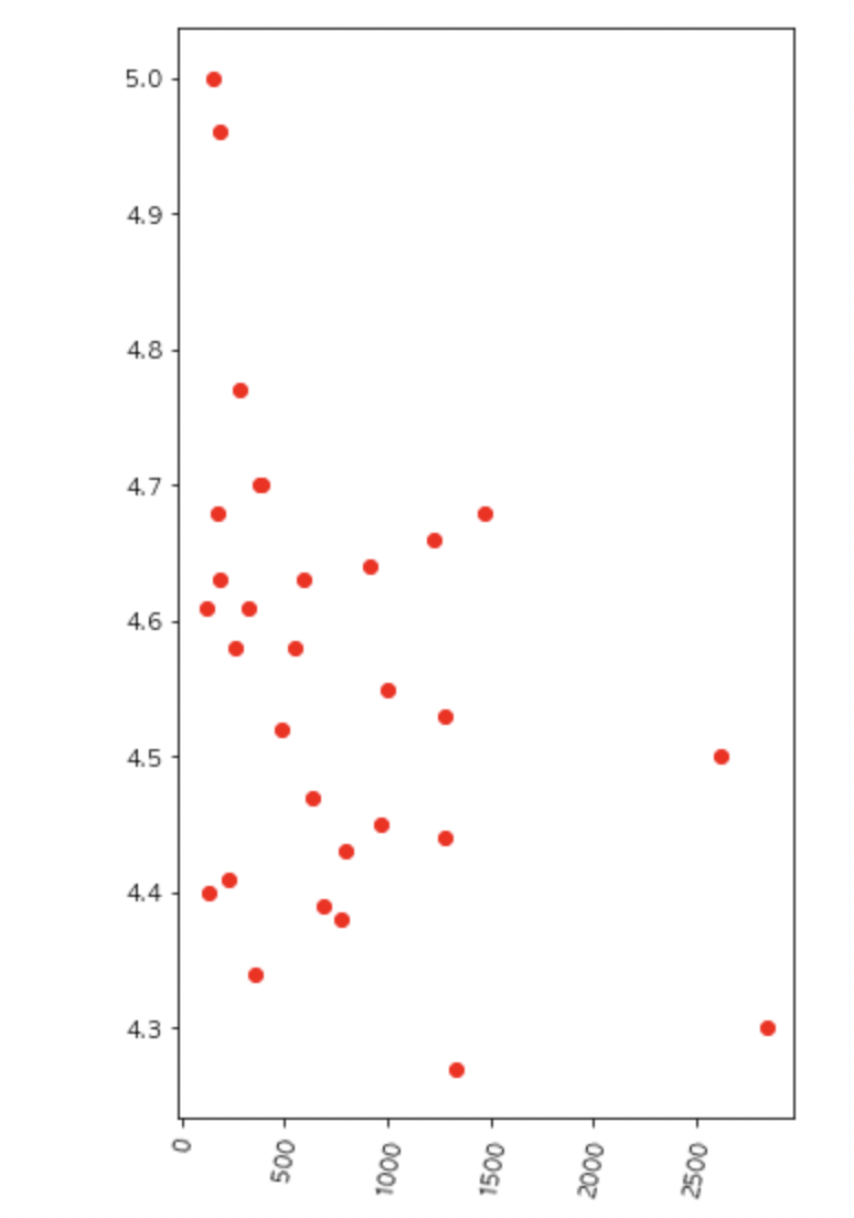 이렇게 크롤링해온 데이터를 필요에 따라 (사진에서는 별점 순으로) 나열하고, 그로부터 블로그 리뷰와 별점의 상관관계를 그래프로 간단하게 그려봤다.