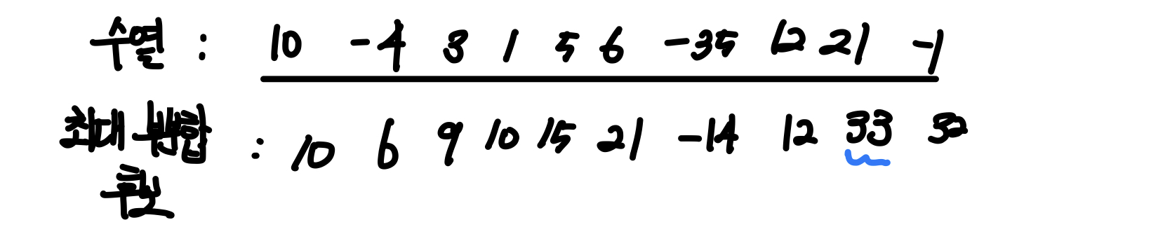 예제 기준으로 최대 부분합 후보를 나열해보면 다음과 같다.