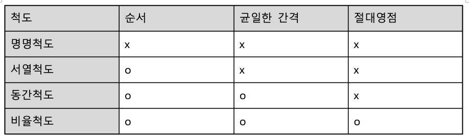 척도는 네 가지로 구분할 수 있다. 명명척도, 서열척도, 동간척도, 비율척도가 그것이다.